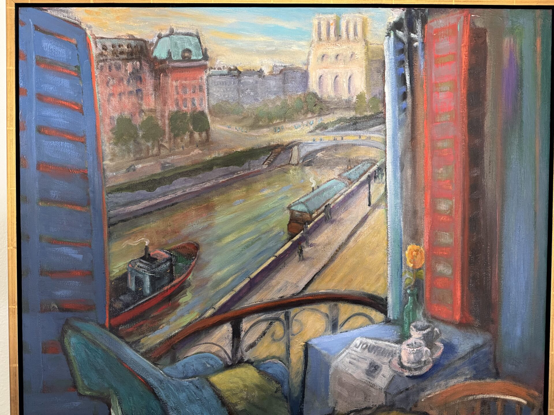 It was nothing like we expected. The scene was a view from a window, with shutters opened wide. In the foreground, espresso cups and a folded newspaper sat on a table. Outside the window was the river Seine with barges moored, and small figures strolling along the quais. On the opposite bank were Paris’ quintessential elegant buildings with their Mansard roofs. And in the distance, the iconic Notre Dame cathedral.